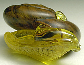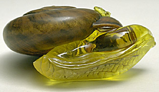 The tiny snail crawls on the shell of a larger snail, which is crawling on a leaf.