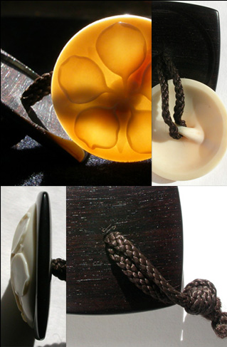An apple blossom is carved in shallow relief on the lid of this small manju style netsuke.