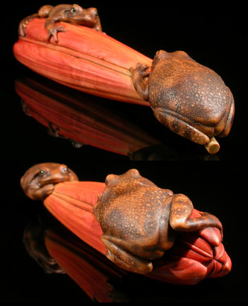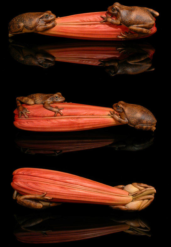 Ukibori: raised bumps on the skin of the frogs, results from compression of the wood, shaving/sanding down to the finished depth, then raised with an application of hot water.