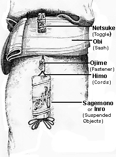 A netsuke is a form of miniature sculpture which developed in Japan over a period of more than three hundred years. Netsuke served both functional and aesthetic purposes. The kimono, the traditional form of Japanese dress, had no pockets. Women would tuck small personal items into their sleeves, but men suspended their tobacco pouches, pipes, purses, or writing implements on a silk cord from their obi (kimono sash). These hanging objects are called sagemono. To stop the cord from slipping through the obi, a small toggle was attached. The toggle is called a netsuke. (The most popular pronunciation is "net-ski", while the actual Japanese is closer to "netskeh"). A sliding bead (ojime) was strung on the cord between the netsuke and the sagemono to tighten or loosen the opening of the sagemono.